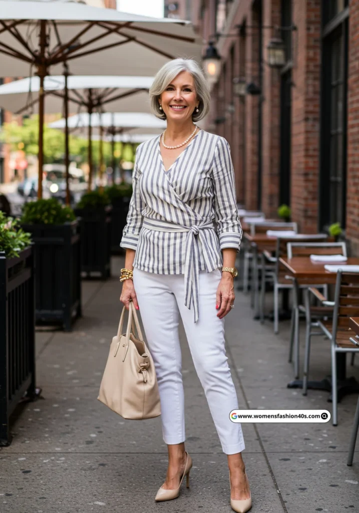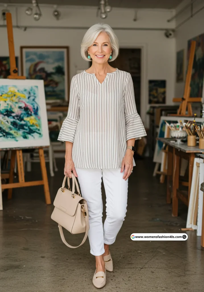 This look became my go-to for spring gallery visits in San Diego. Google Trends indicates stripes are a top search for mature women, offering a timeless, versatile pattern for everyday sophistication.