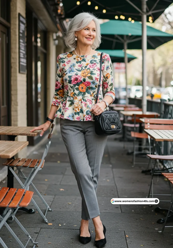 16. Floral Peplum Tunic + Grey Tailored Pants + Black Flats + Black Crossbody