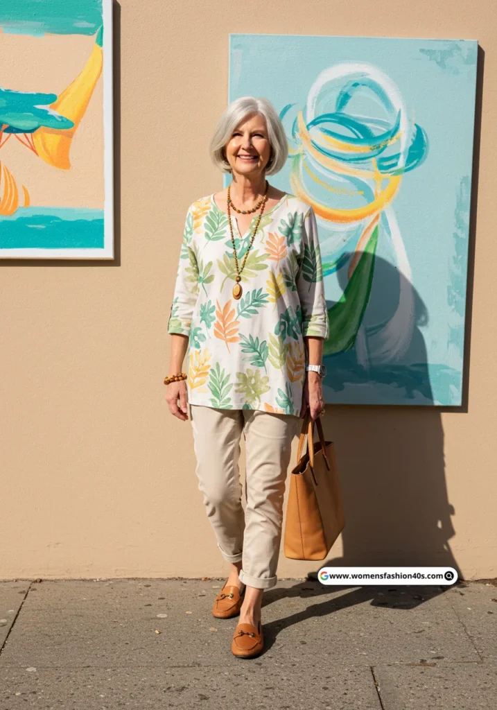 I wore this for a weekend brunch in Los Angeles, and the soft floral pattern instantly brightened my outfit. Pinterest shows floral tunics trending among women over 60, making casual elegance effortless and fun.