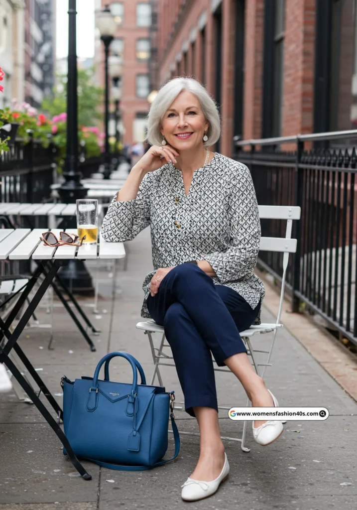 I wore this casual outfit for lunch in Boston. Geometric prints are growing in popularity on Pinterest for women over 60, adding modern and stylish elements without feeling too bold.