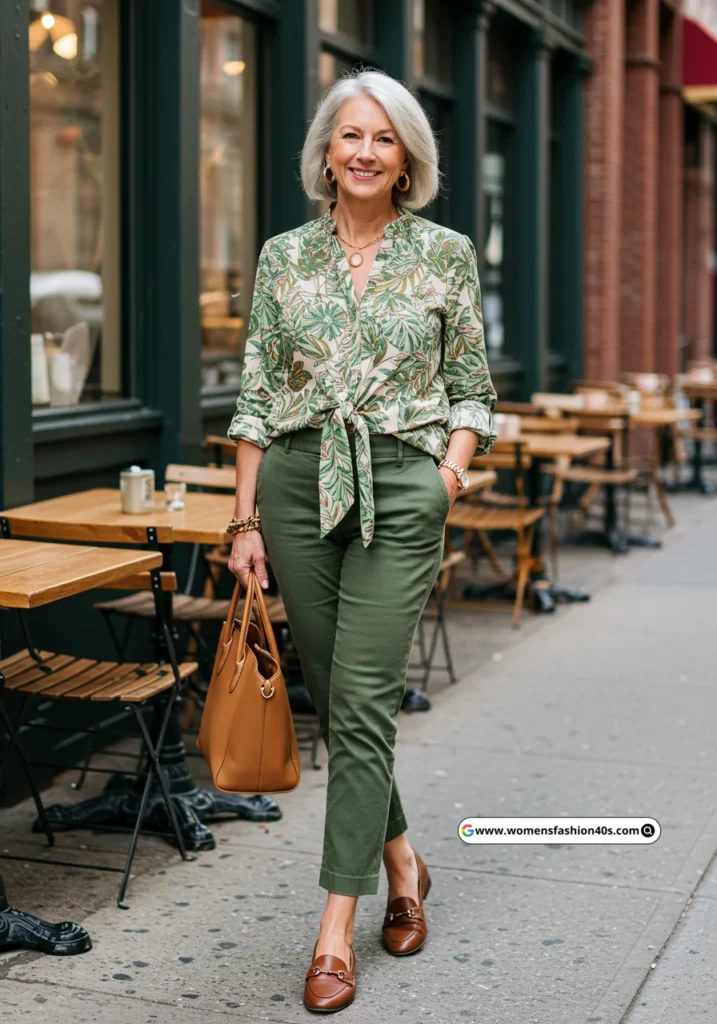 20. Leaf Print Tie-Neck Tunic + Olive Tailored Pants + Brown Loafers + Tan Tote