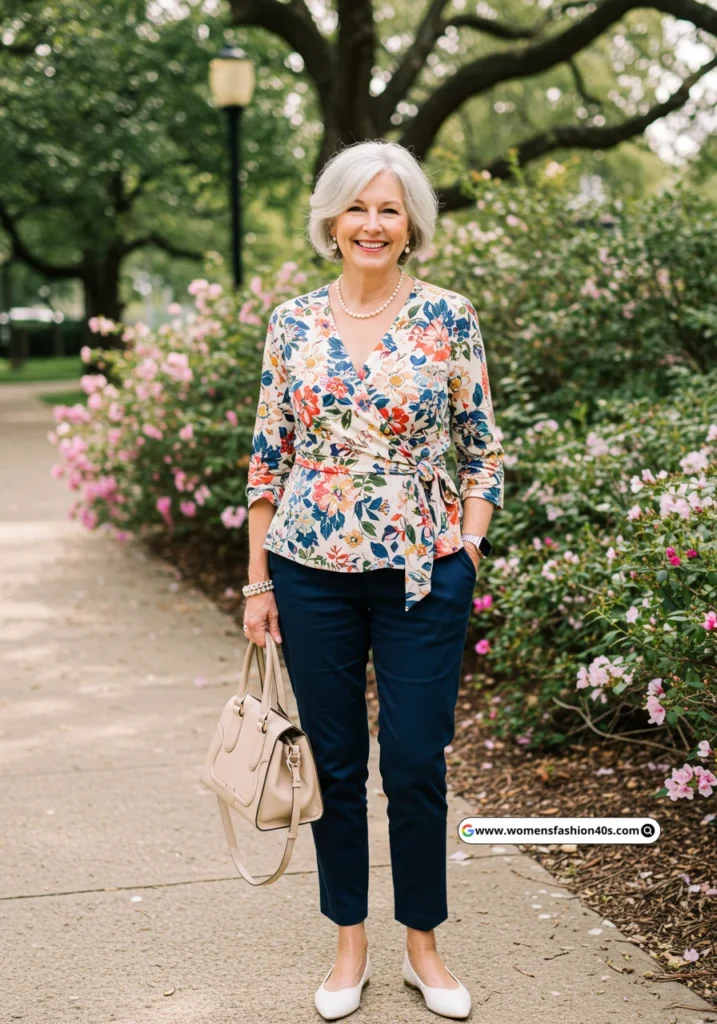 I chose this for a spring brunch in Austin. Wrap-style tunics are trending on Pinterest for women over 60, offering flattering silhouettes and effortless elegance with minimal effort.