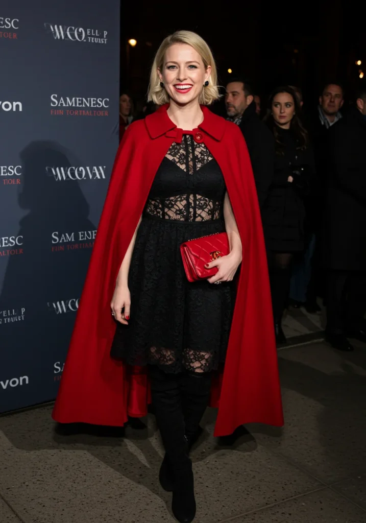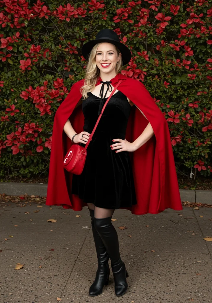 Shop Now from Amazon: Black Lace Dress + Red Cape + Black Boots + Red Bag