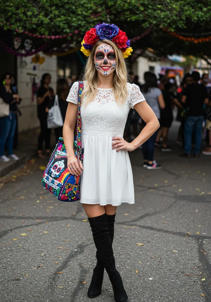 Celebrating Dia de los Muertos inspired this vibrant look. I loved how creative makeup made this costume unforgettable. Statista notes increased interest in cultural-inspired costumes for women.