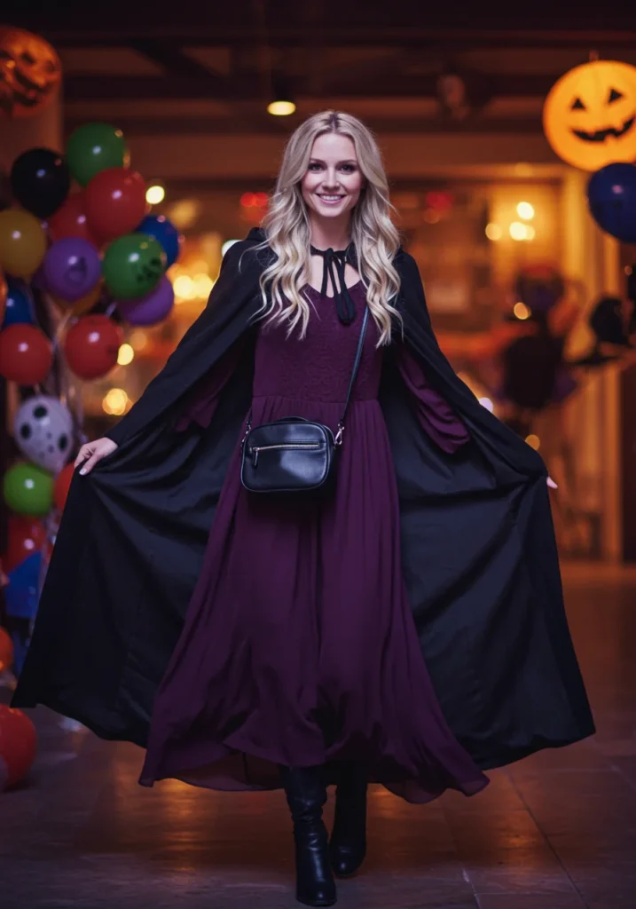 Shop Now from Amazon: Dark Purple Dress + Black Cloak + Black Boots + Black Bag
