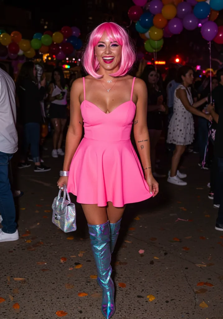 Shop Now from Amazon: Neon Pink Dress + Metallic Boots + Pink Wig + Silver Bag
