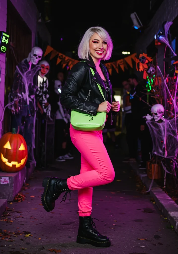 Shop Now from Amazon: Black Leather Jacket + Neon Pants + Black Boots + Neon Bag