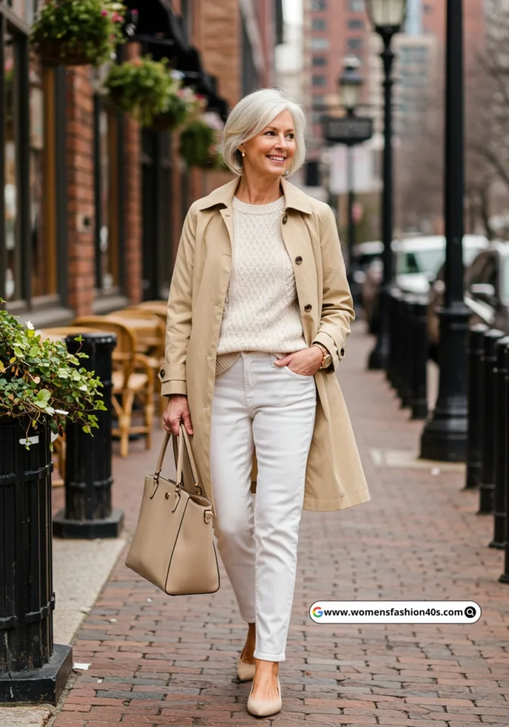 Outfit: Soft Beige Raincoat + Cream Knit Sweater + White Straight-Leg Pants + Nude Flats + Beige Tote