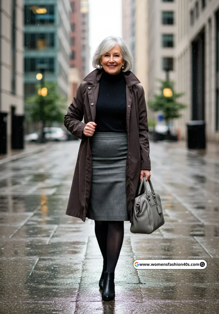 This charcoal coat is perfect for professional settings. I wore it to a client meeting in Chicago, staying dry while looking polished. Forbes emphasizes practical outerwear as a wardrobe essential for women over 60.