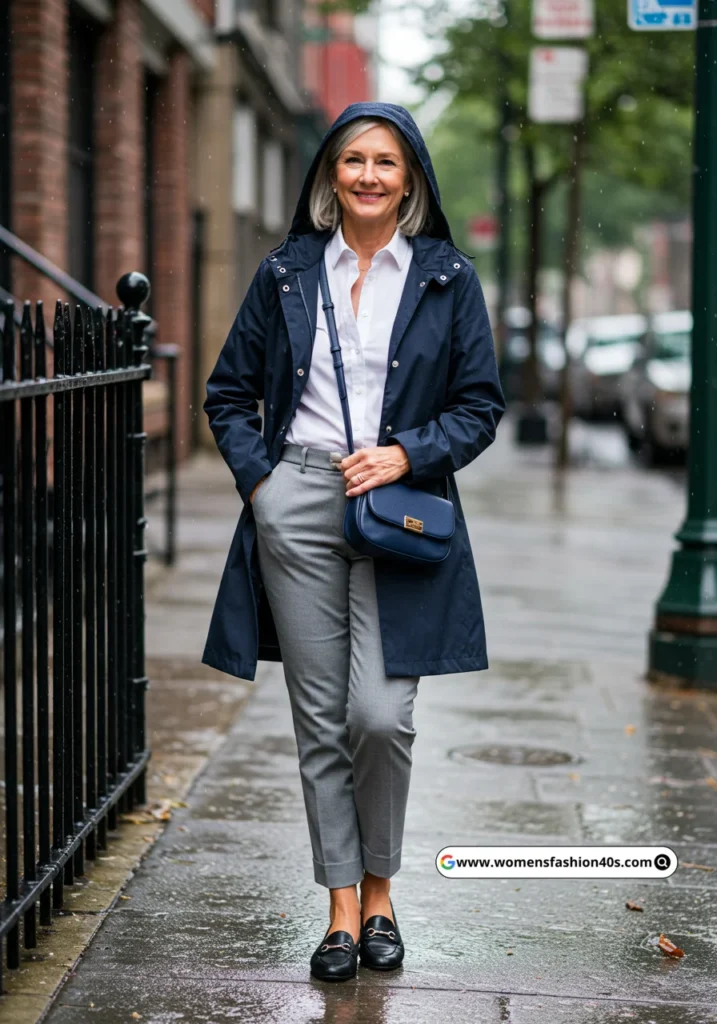 I remember wearing this navy trench on a rainy Seattle morning and feeling instantly polished. Its waterproof fabric kept me dry, while the classic silhouette elevated my confidence. Pinterest Trends show searches for “stylish raincoats over 60” up 40%, proving mature women crave chic practicality.