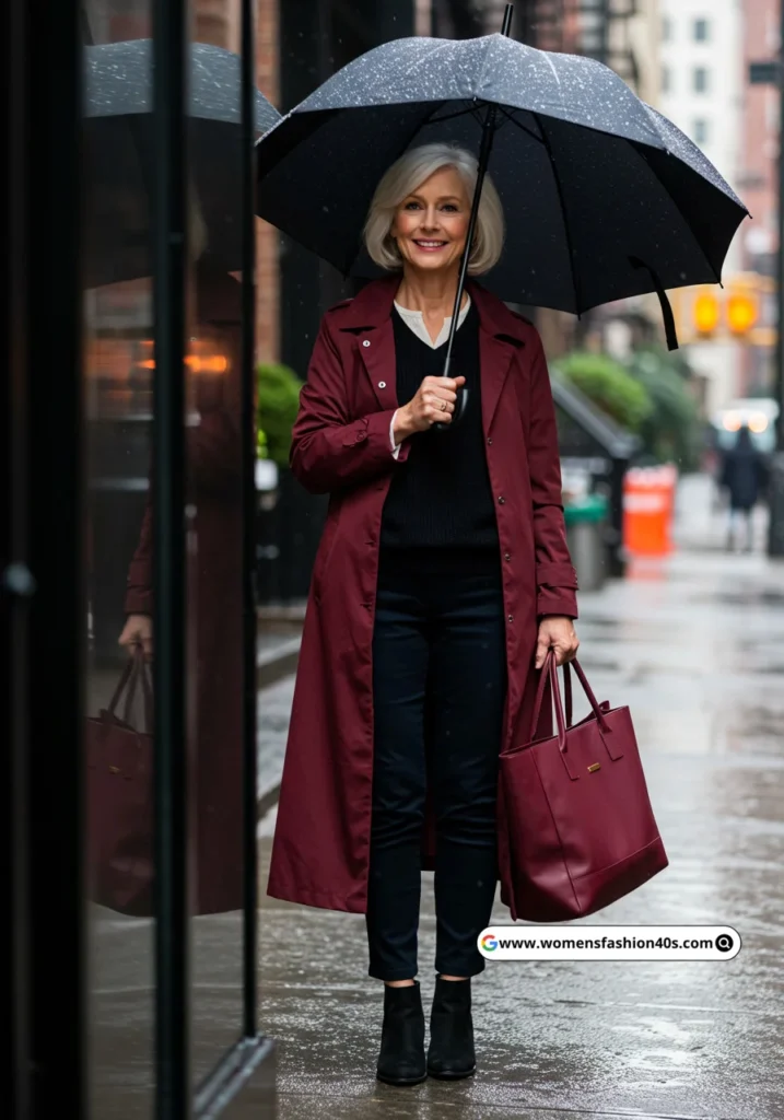 This long burgundy raincoat feels luxurious and dramatic on rainy days. I wore it in New York, and people kept complimenting my look. Its rich color is trending on Pinterest for mature fashion.