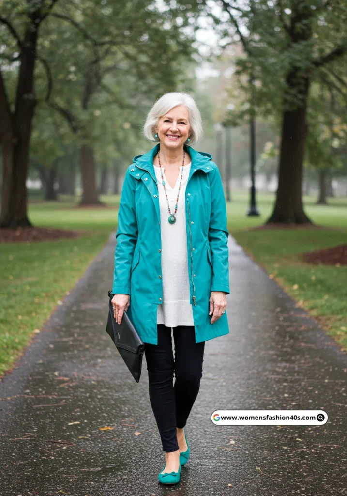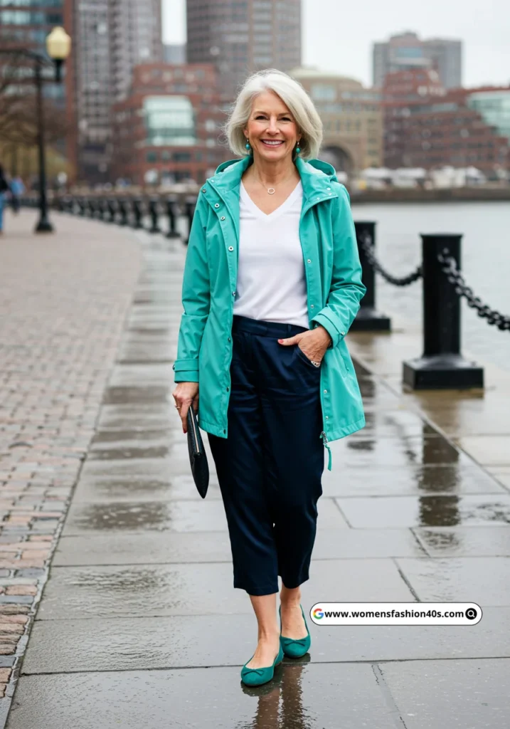 Teal is such a playful color for rainy days! I wore this jacket walking through Boston’s waterfront, feeling confident and chic. Pinterest trends show teal outerwear for older women is gaining popularity.