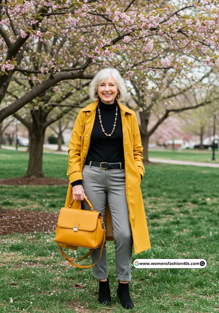 The vibrant mustard raincoat brightened gloomy spring days in Atlanta. Statista reports yellow outerwear searches spiked among women over 60 this year, reflecting the trend for joyful colors.