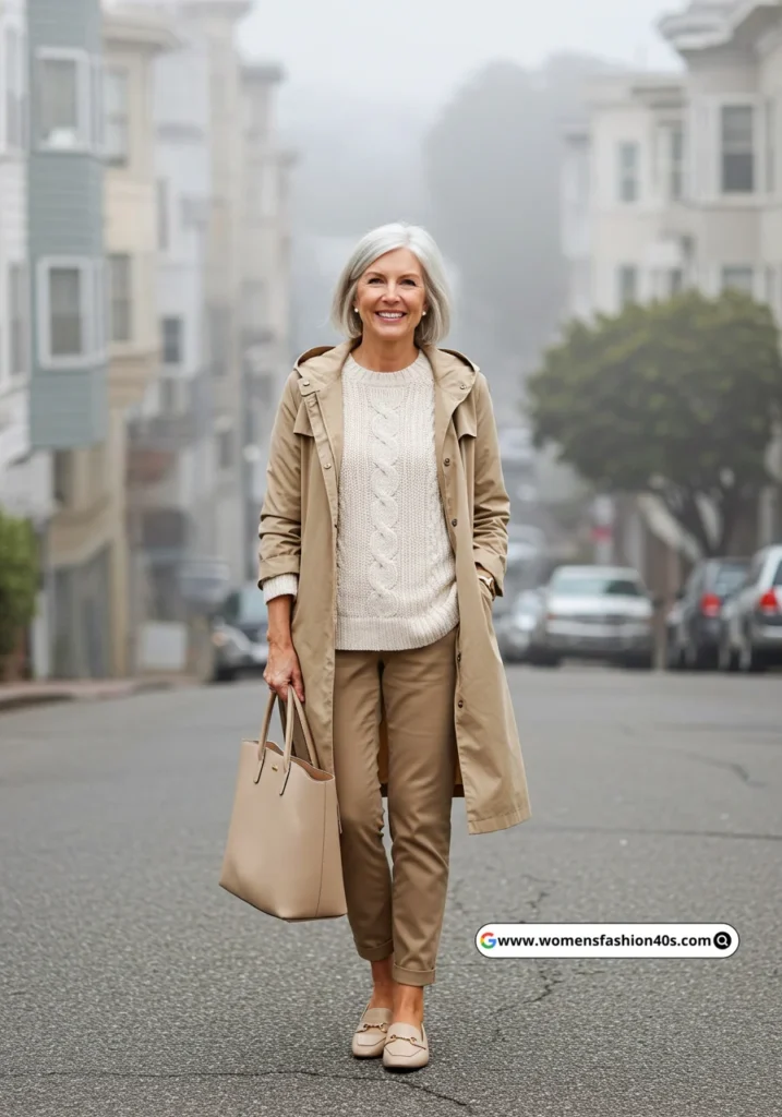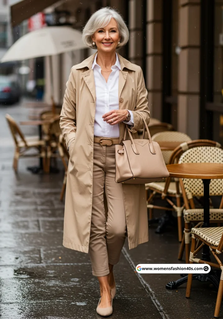 I paired this taupe coat with beige pants in New York, and the ensemble felt sophisticated yet effortless. Pinterest analytics show that belted raincoats for older women are trending upward this season.