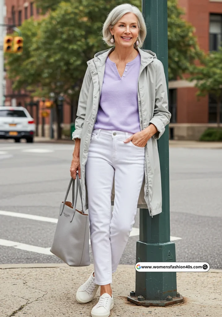 Outfit: Light Grey Raincoat + Lavender Top + White Straight-Leg Jeans + White Sneakers + Grey Tote