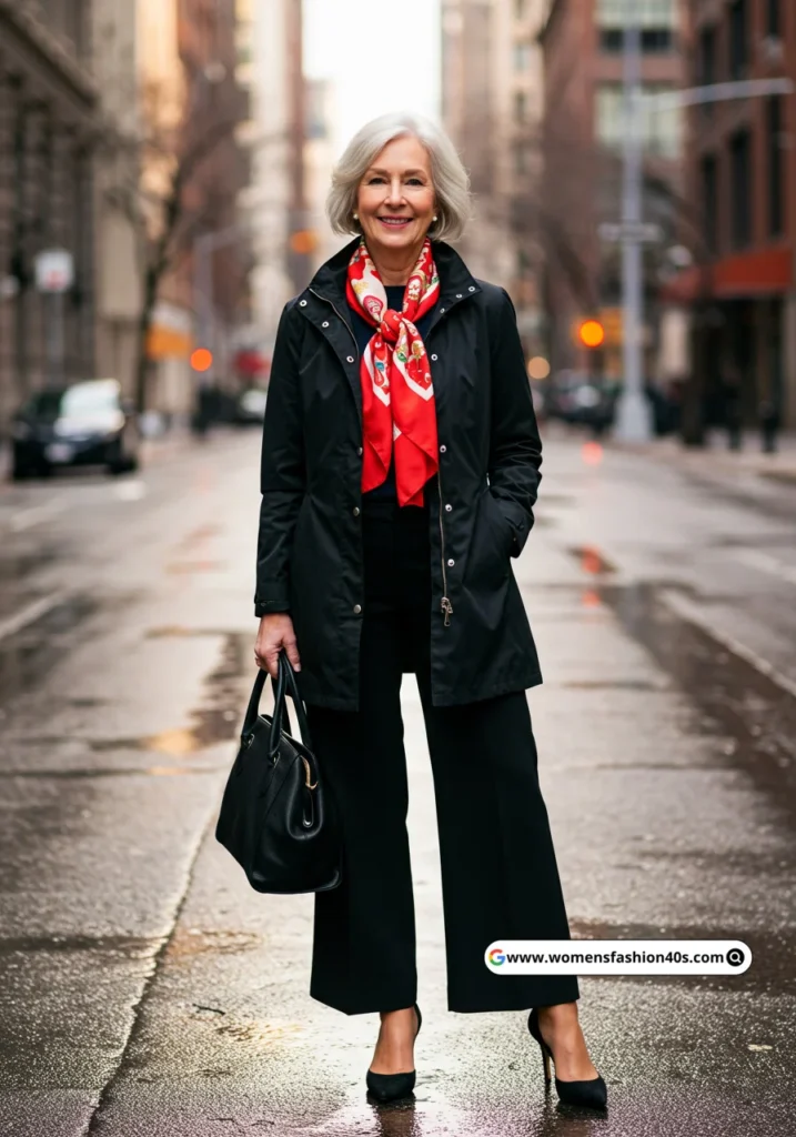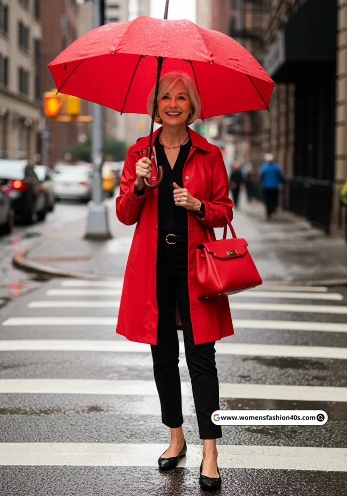 This classic red coat makes a bold statement. On a rainy Manhattan afternoon, I felt empowered and stylish. Vogue highlights red outerwear as a must-have statement piece for mature women.