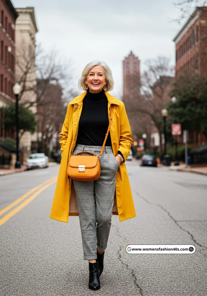 The hooded mustard coat is perfect for spring showers. Its cheerful color and practical design make rainy days enjoyable. Pinterest trends confirm mustard outerwear is popular for women over 60.