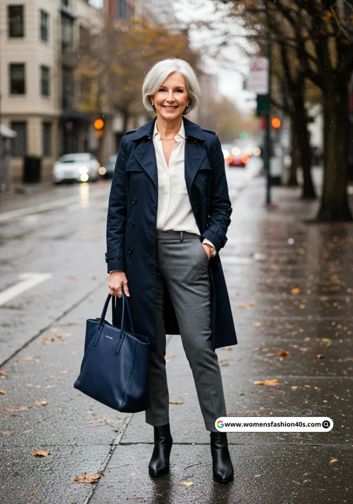 Shop Now from Amazon: Navy Trench Coat + White Silk Blouse + Charcoal Grey Trousers + Black Leather Ankle Boots + Navy Leather Tote