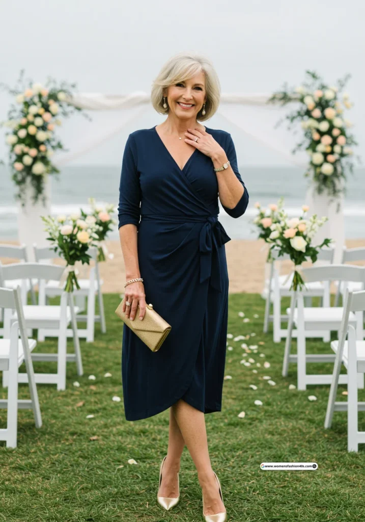 At a seaside wedding in San Diego, this wrap dress hugged my curves perfectly. Google Trends indicates navy dresses for mature guests are trending, and it added a sophisticated, timeless appeal.