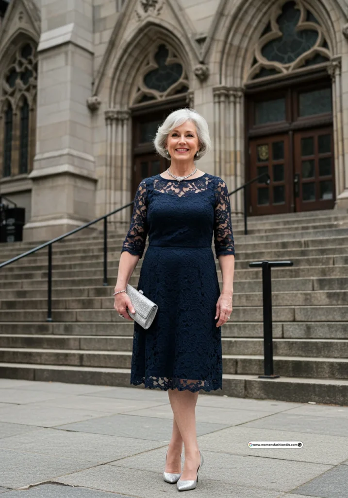 At a cathedral wedding in New York, this lace dress felt regal yet approachable. Google Trends shows navy lace is a favorite for women over 60 attending formal weddings.