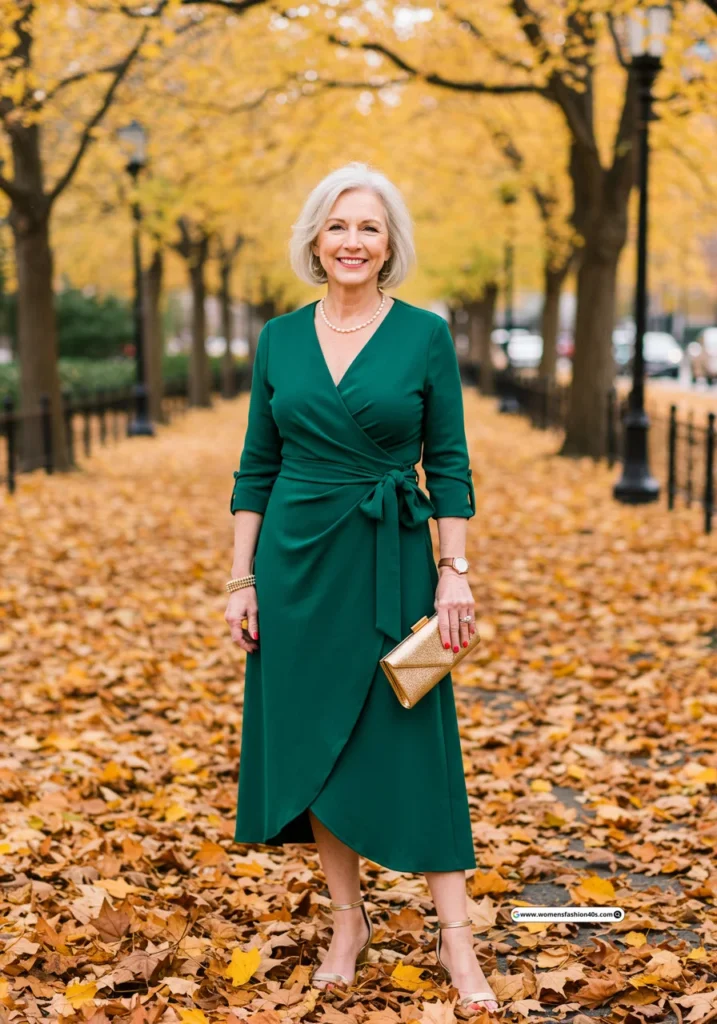 I wore this to an autumn wedding in Boston. Statista confirms wrap dresses in jewel tones are trending among mature female guests, giving flattering structure and confident elegance.