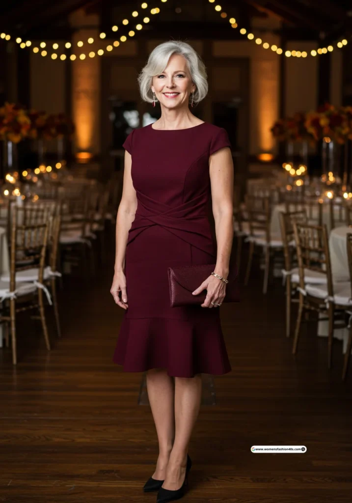 I wore this dress to a fall wedding in New York and instantly felt confident. Pinterest Trends shows burgundy midi dresses are top-saved for mature women attending weddings, and the color made me feel festive and elegant.