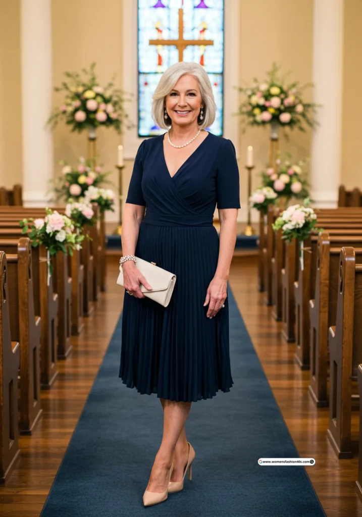 I wore this to a spring wedding in Denver. Pinterest shows pleated dresses are top-saved for mature guests, offering movement, elegance, and a graceful silhouette.