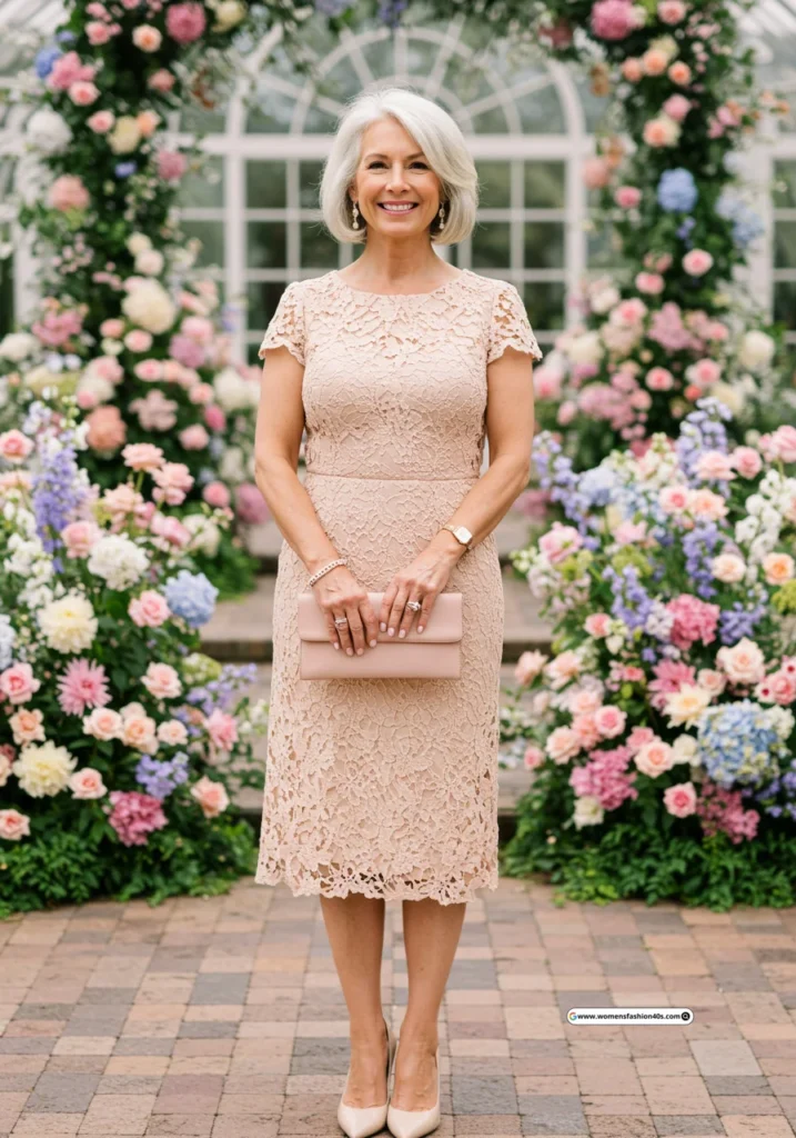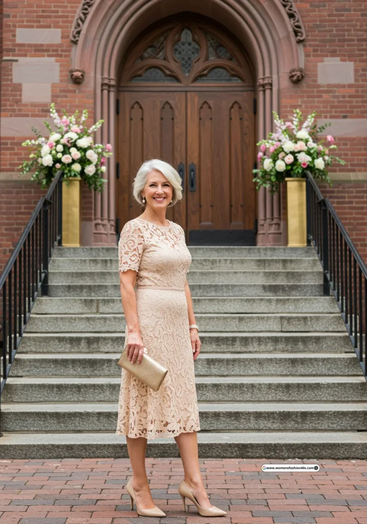This lace dress felt perfect for a formal church wedding in Boston. Pinterest highlights lace dresses as highly saved by mature female guests, giving an effortlessly classy vibe.