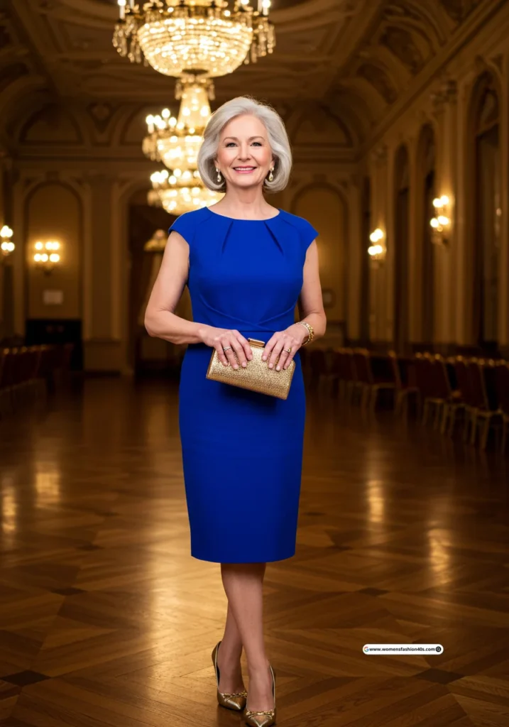 I wore this for an evening ballroom wedding in New York. Google Trends highlights royal blue as a favorite among mature guests, making it a bold, chic, and head-turning choice.