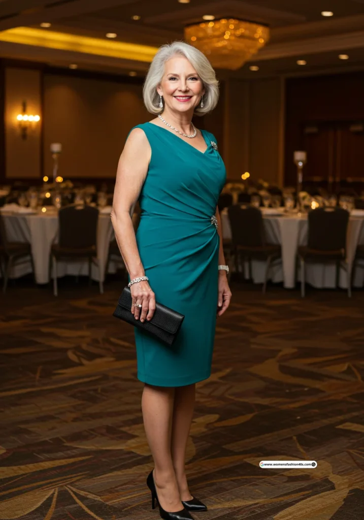 At a lakeside wedding in Michigan, this bold jewel tone felt festive yet age-appropriate. Pinterest indicates teal is increasingly popular among mature guests seeking standout looks.
