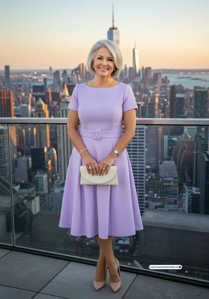 7. Lavender Fit-and-Flare Dress with Nude Pumps