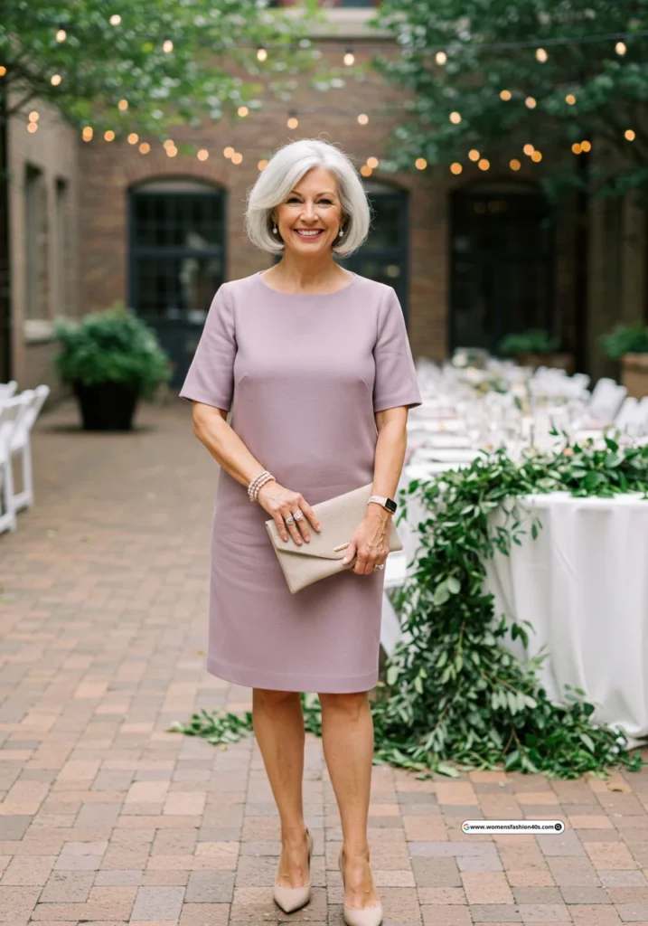 10. Mauve Shift Dress with Taupe Heels