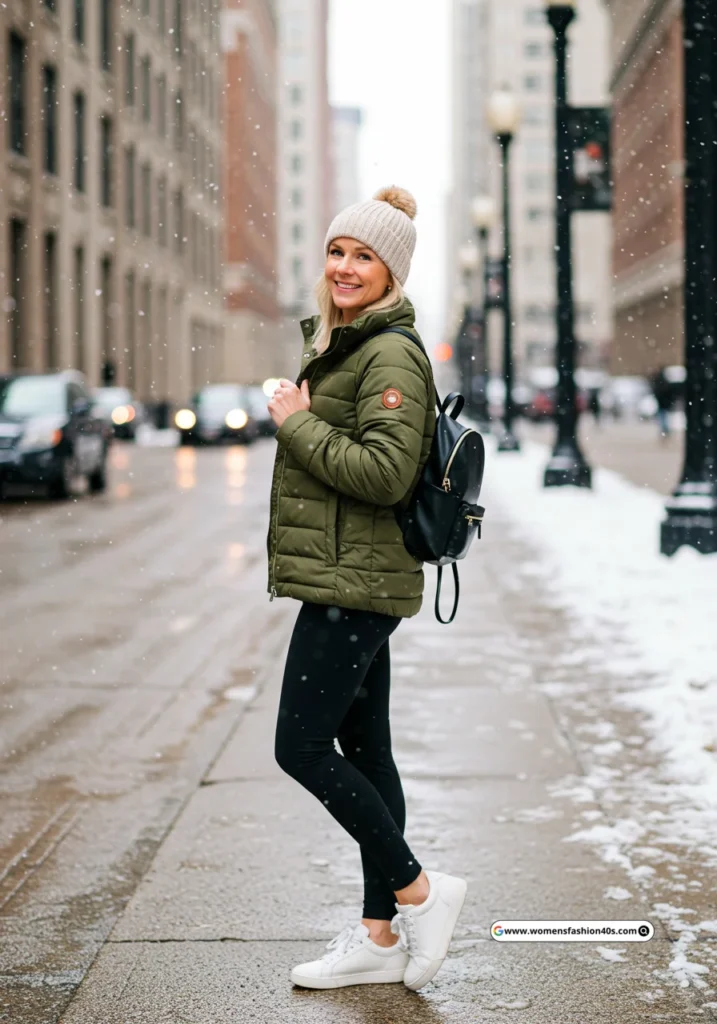 Shop Now from Amazon: Olive Green Puffer Jacket + Black Leggings | Olive Jacket + Black Leggings | White Sneakers | Black Backpack