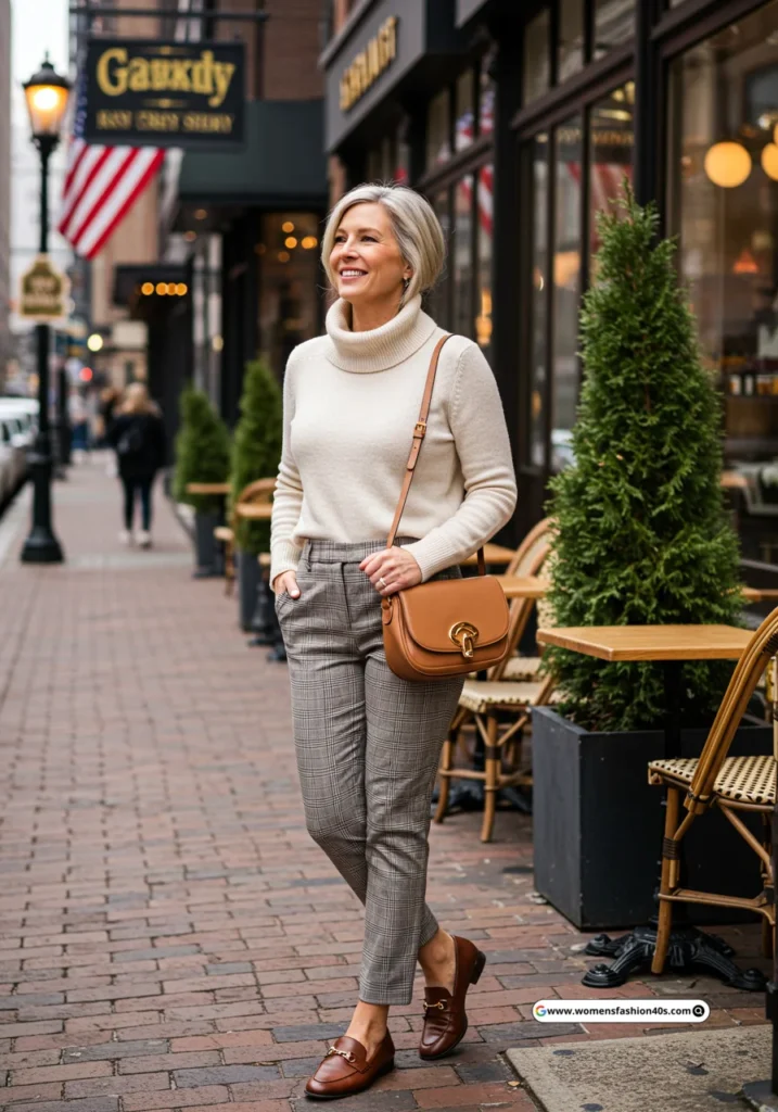 I loved this cozy cream turtleneck with plaid pants for coffee dates in Boston. Pinterest and Statista report plaid pants are trending for 2025 winter looks, adding flair to a warm outfit.