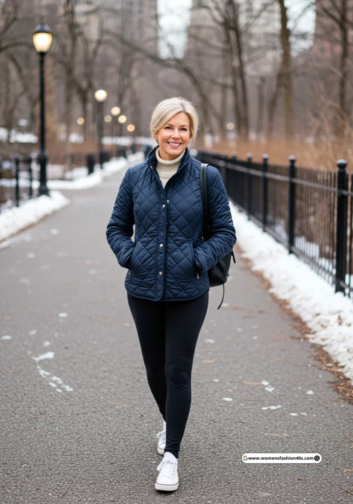This navy quilted jacket was my favorite for casual winter walks. Google Trends indicates quilted jackets are gaining searches across the US, and the outfit was perfect for comfort without sacrificing style.