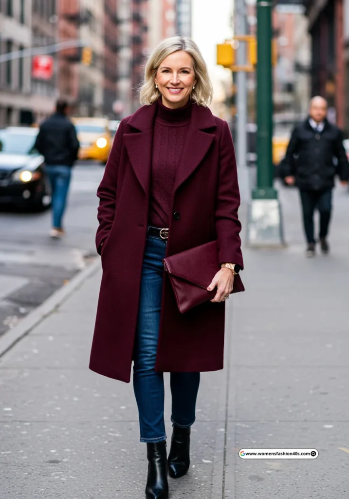 I felt so chic wearing this burgundy wool coat in New York. Pinterest Trends show jewel-toned coats are popular this season, and the look was cozy yet statement-making.