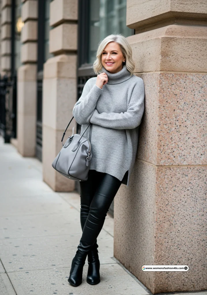 Shop Now from Amazon: Gray Oversized Sweater + Black Leather Leggings | Gray Sweater + Black Leggings | Black Boots | Gray Bag