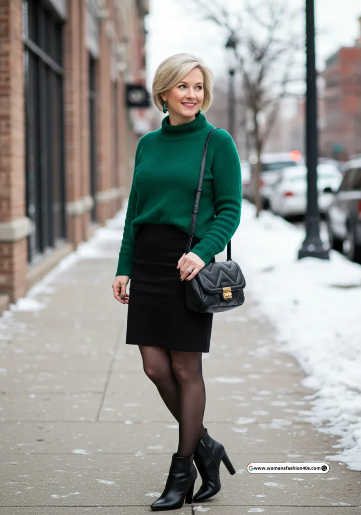 Shop Now from Amazon: Emerald Green Sweater + Black Skirt | Green Sweater + Black Skirt | Black Heeled Boots | Black Bag