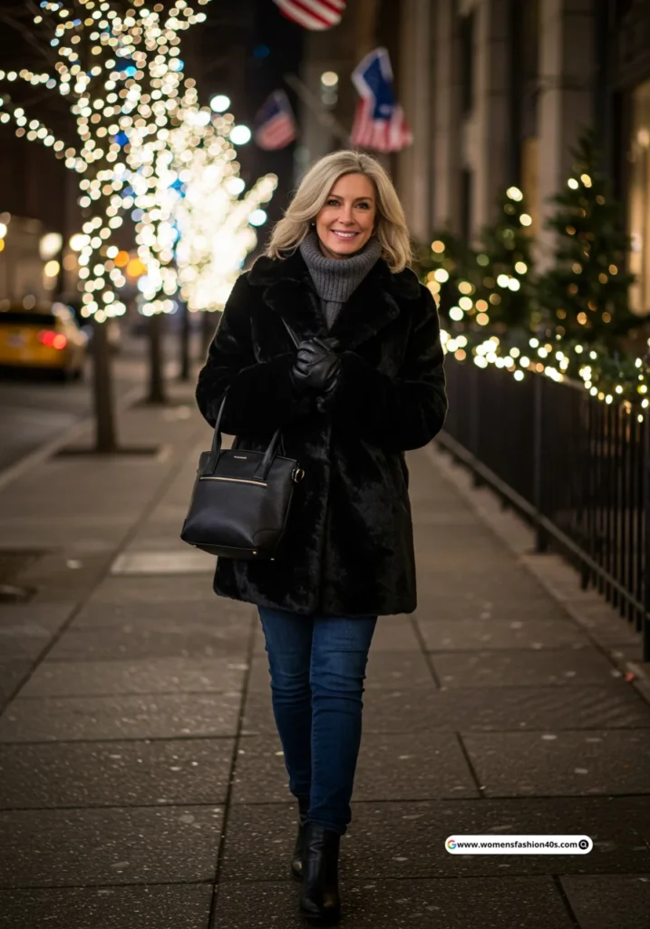 I felt glamorous and warm in this faux fur coat during NYC holiday events. Vogue and Harper’s Bazaar suggest fur textures elevate winter looks effortlessly, and I totally agree.