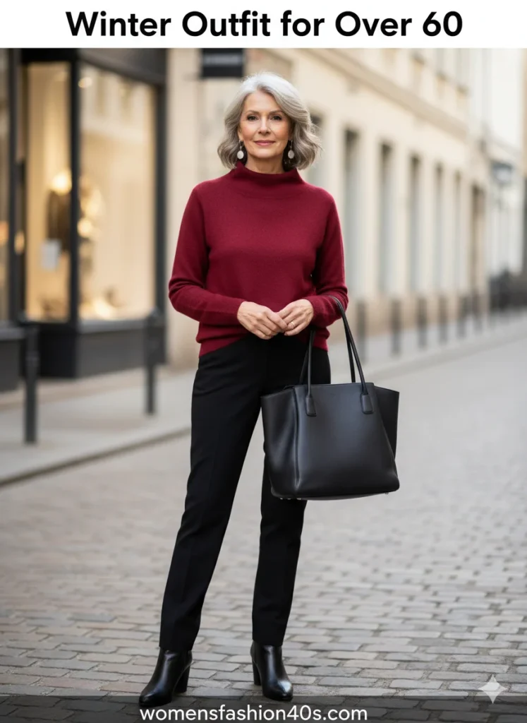 Shop Now from Amazon: Wine-Red Funnel-Neck Sweater + Black Tailored Trousers + Black Heeled Boots + Black Tote