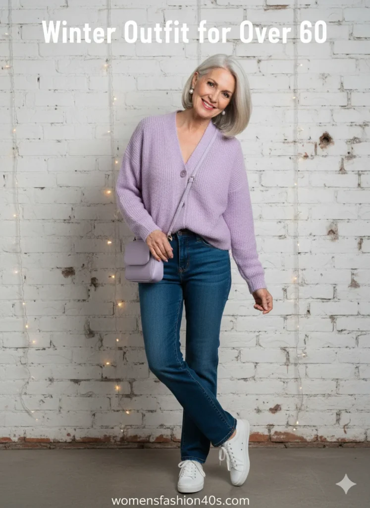 18. Soft Lilac Cardigan with Straight Dark Denim