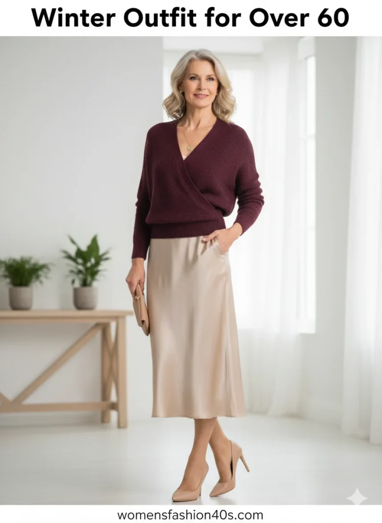 9. Plum Wrap Sweater with Satin Midi Skirt