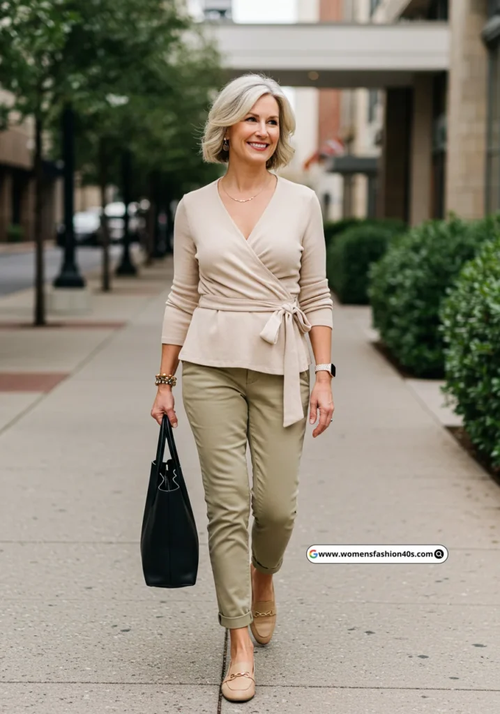 Perfect travel look for Dallas—comfortable and stylish. Google Trends shows “wrap top + chinos outfits” trending among women over 40.