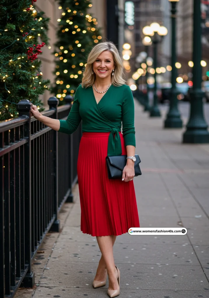 Festive Chicago holiday dinner look—timeless and cheerful. Pinterest reports red pleated skirts spiking 35% during holidays for women over 40.