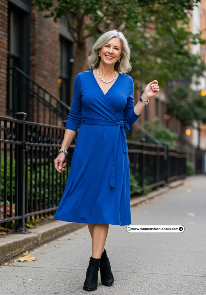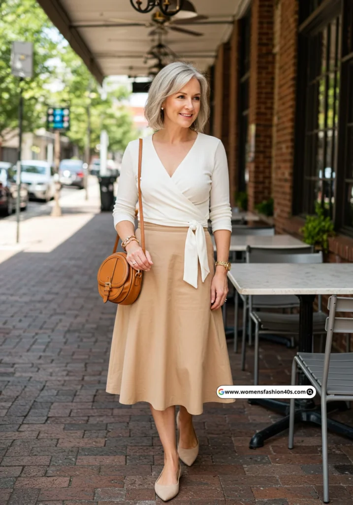I wore this combo to a business brunch in New York—it felt polished yet cozy. Pinterest Trends show “wrap tops over 40” and pencil skirt pairings trending, confirming this classic office-chic look is age-appropriate and timeless.