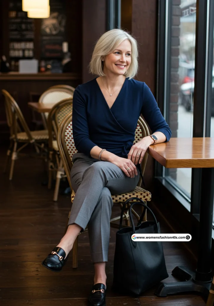 Perfect for a Boston coffee meeting—polished and comfortable. Pinterest Trends shows gray trousers with wrap tops as a top office outfit search for women 40+.